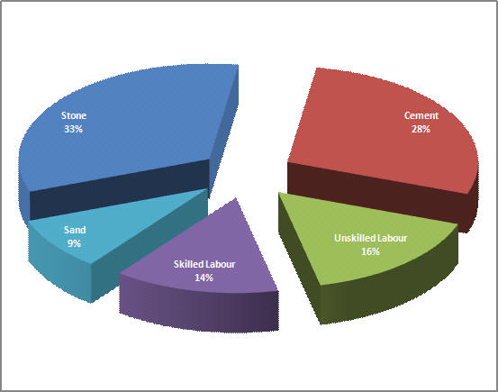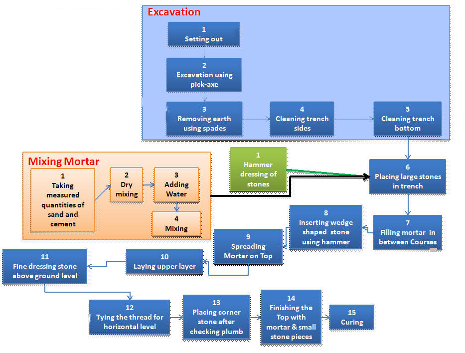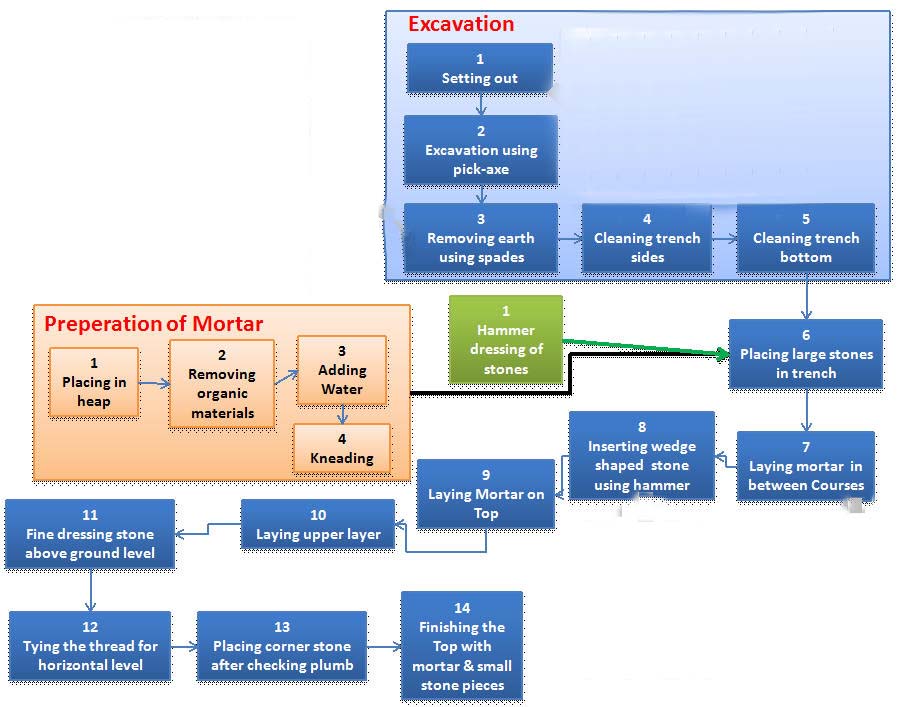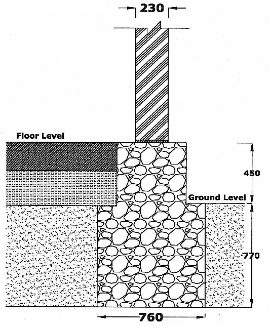 The place where stone is in abundance or in rocky or hilly terrains, the brick may not be viable solution for foundations. Therefore brick is replaced by stone and this system of foundation works out to be cheaper, however, it is equally strong and durable and can be constructed by local mesons. A typical stone footing consist of several course of stones, the lowest course usually 2-2.5times the breadth of the wall above. A bed of lean concrete of uniform thickness is first spread over the entire length of the wall. The depth of concrete bed in normally not less than 150mm and its projection on either side of lowest course varies from 10-15mm